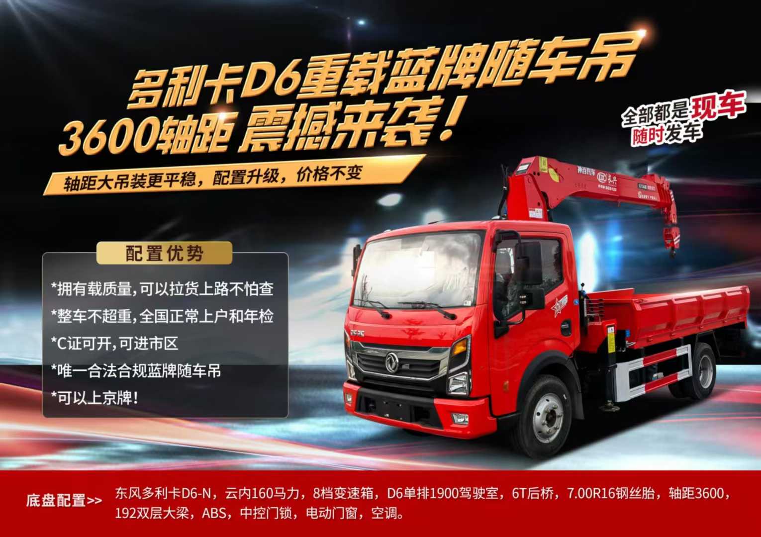 合法合規(guī)重載藍(lán)牌隨車吊特價(jià)來襲,3600軸距穩(wěn)如磐石,拉貨吊裝全能王,C證可開能進(jìn)市區(qū),能上京牌,拉貨不怕查,合法又合規(guī)!東風(fēng)多利卡D6重載版,8檔的變速度,6噸后橋,配置升級價(jià)格不變,現(xiàn)車隨時(shí)發(fā)車!